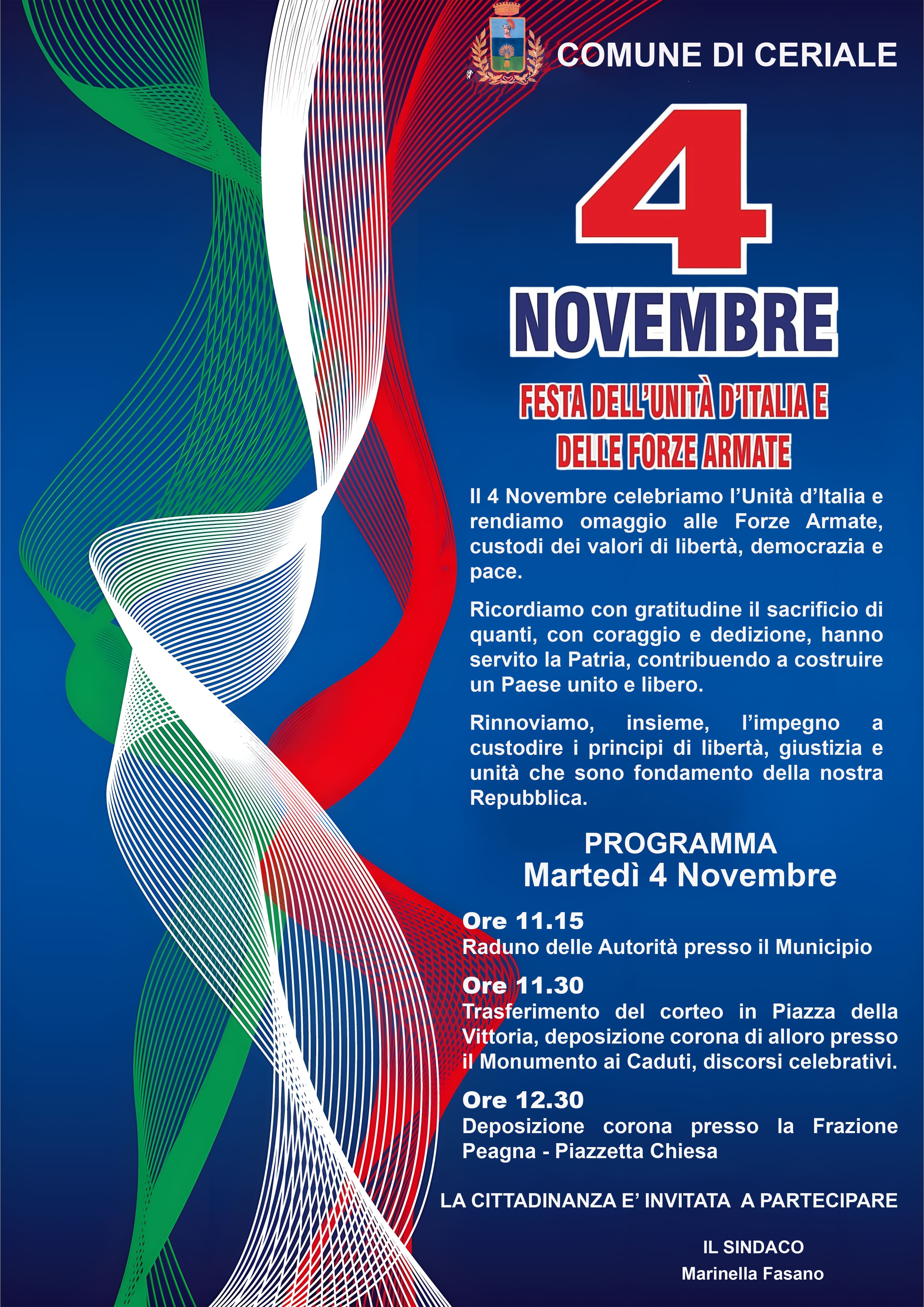 Programma Martedì 4 novembre 2025 Ore 11.15 - Raduno delle Autorità presso il Municipio Ore 11.30 - Trasferimento del Corteo in Piazza della Vittoria, deposizione della corona di alloro presso...